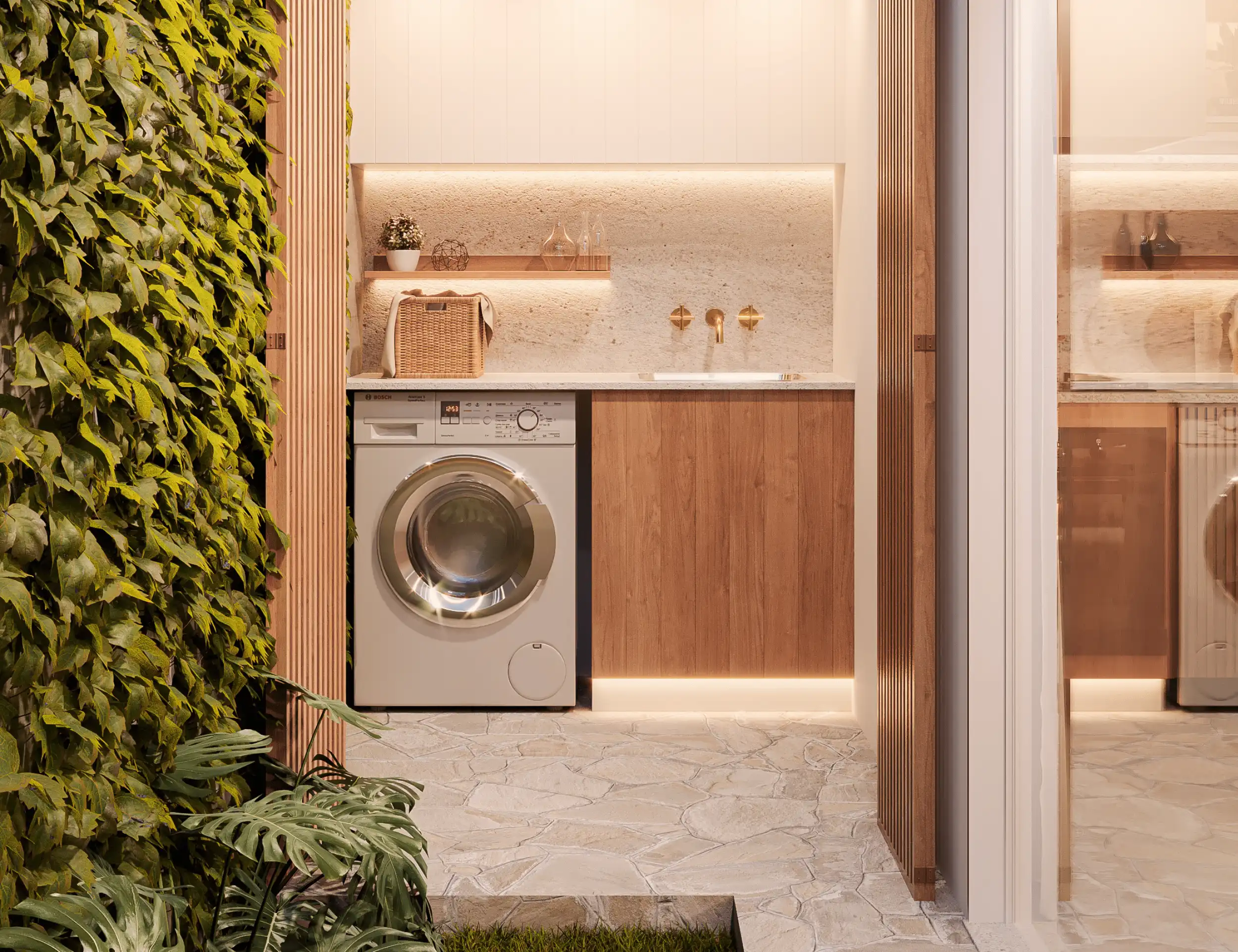 Living no térreo integrado ao quintal, permitindo cozinhar e acompanhar a rotina da casa sem divisões.